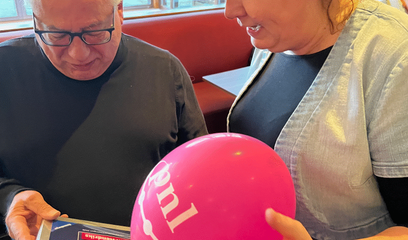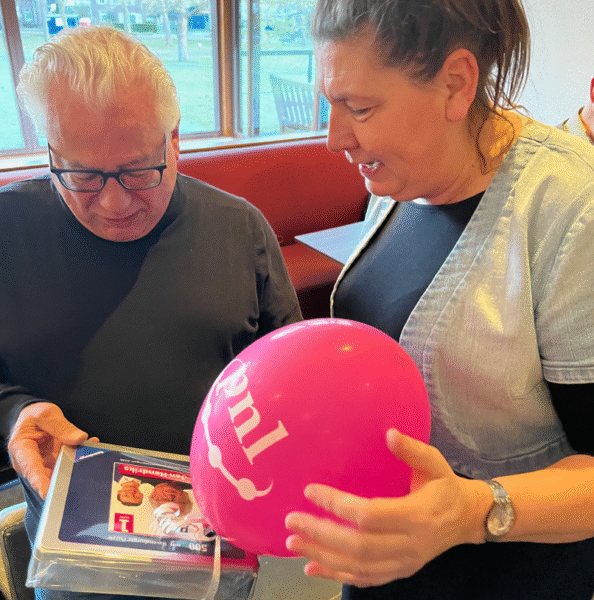 Jan Hendriks kreeg van PNL-bestuursvoorzitter Ilse van Kreij een legpuzzel van zijn laatste verkiezingsposter overhandigd, als bedankje voor alles wat hij voor de partij heeft gedaan.